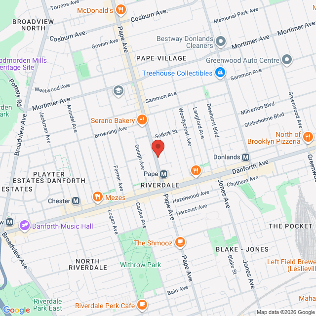 Our Pape office is located just north of Pape Station on line 2. There’s no street parking between 4-6pm, but you can park on the street outside of these hours. Bookings between 4-6 can park in the driveway if it’s vacant. There’s also a Green P on Pape opposite Lipton Ave and next to Souv Like Greek restaurant.